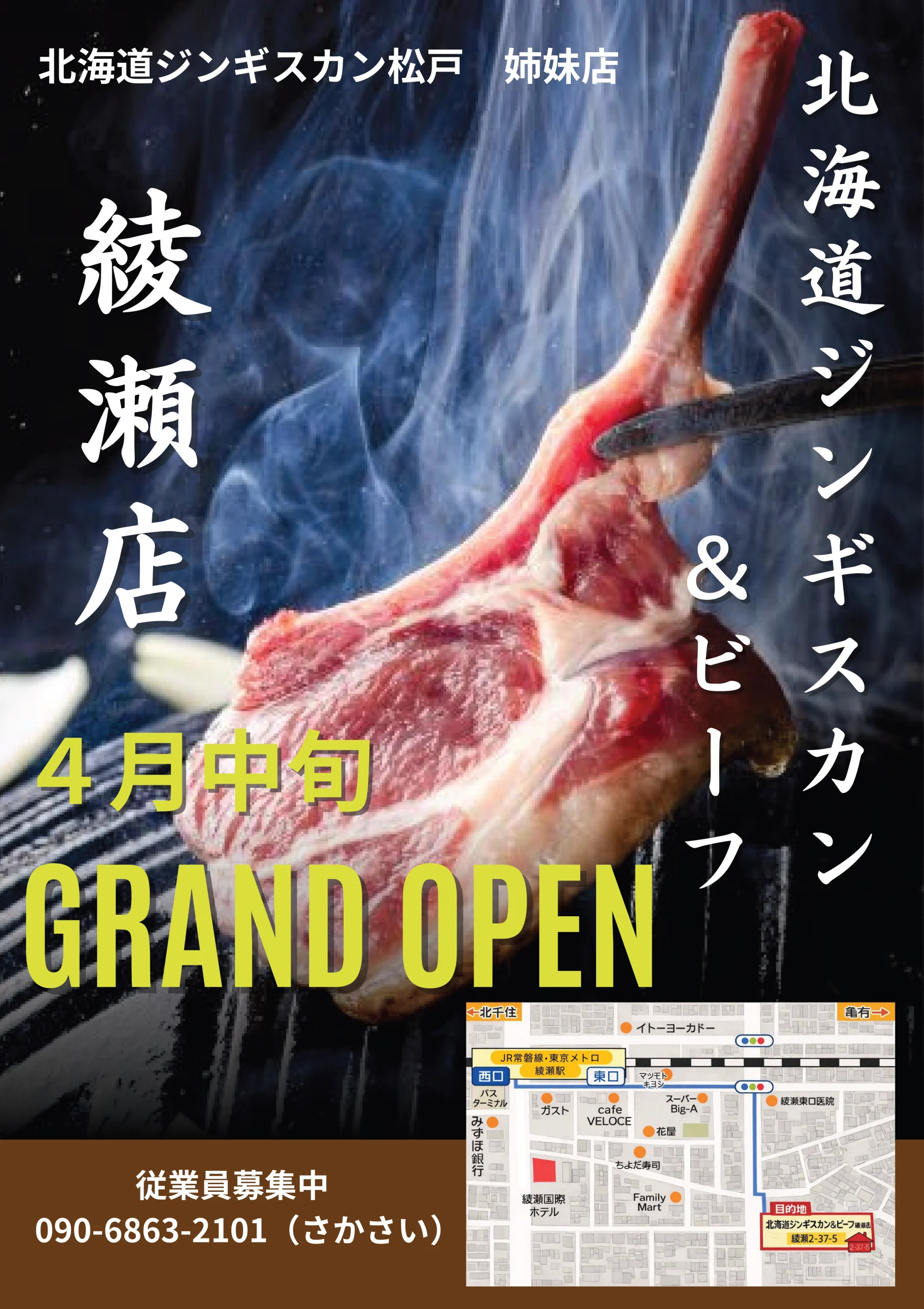 この度、姉妹店「北海道ジンギスカン&ビーフ 野田店」は、3月29日をもちまして現店舗での営業を終了し、4月中旬より東京都足立区綾瀬に移転オープンすることといたしました。